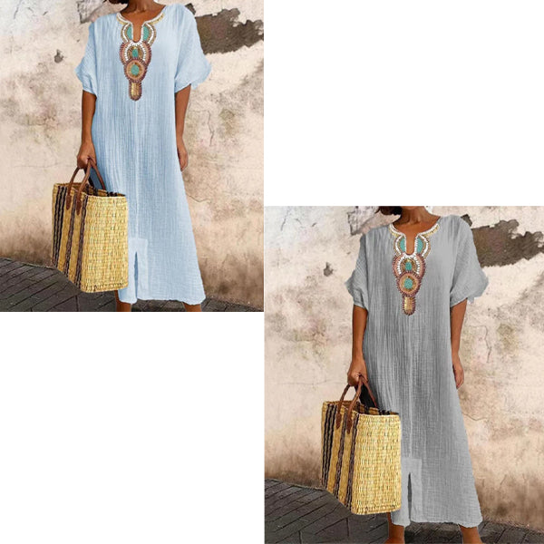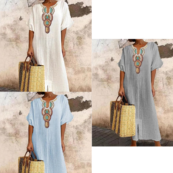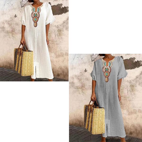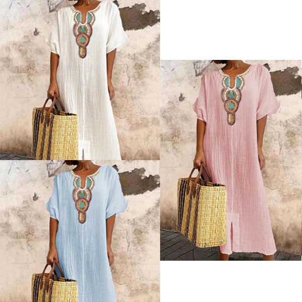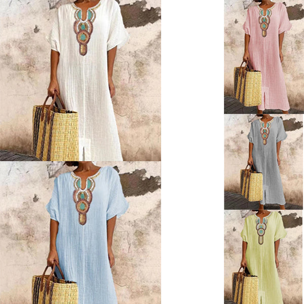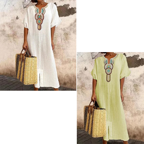 Vestido informal holgado de lino y algodón con abertura bordada para mujer