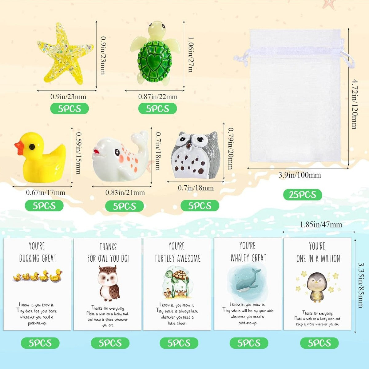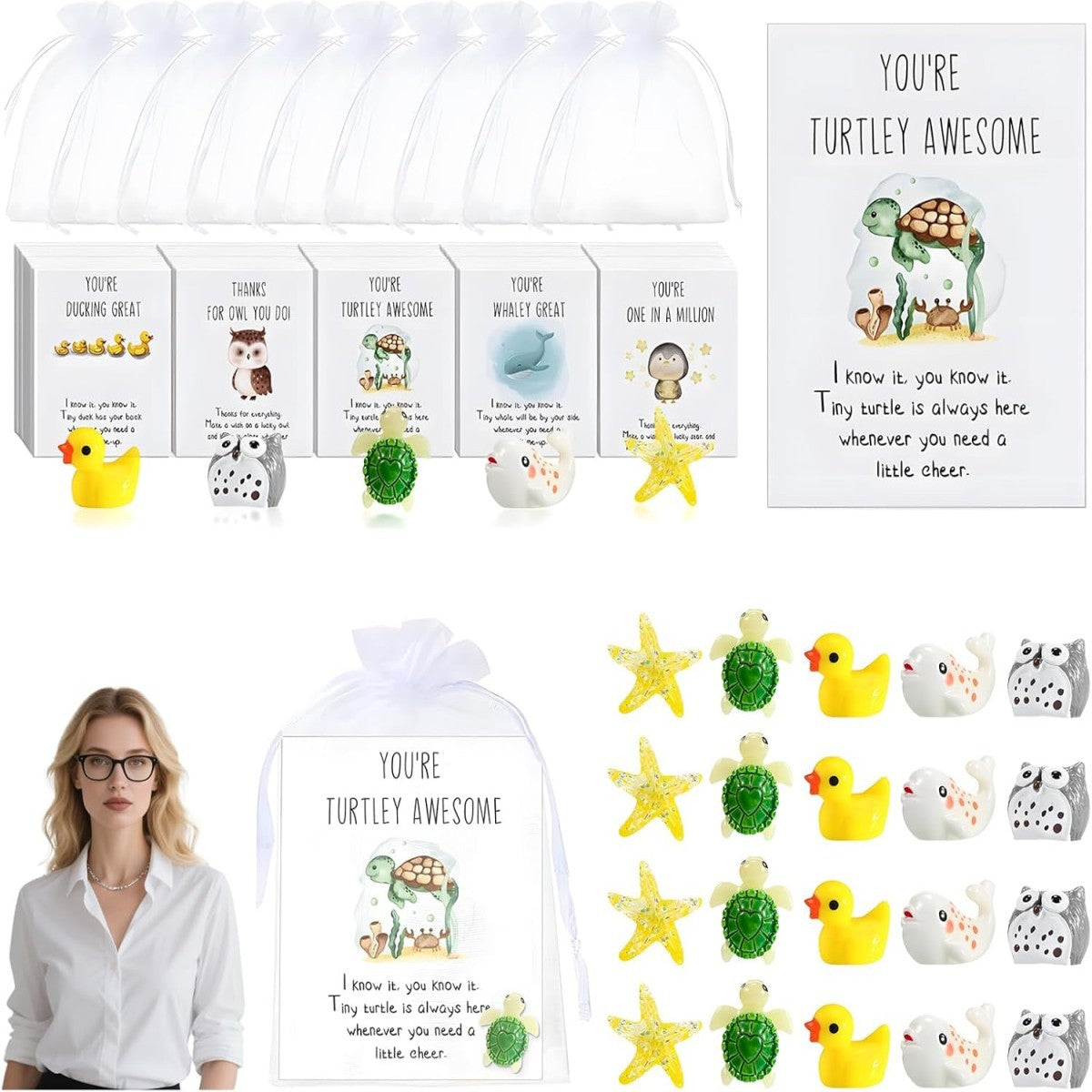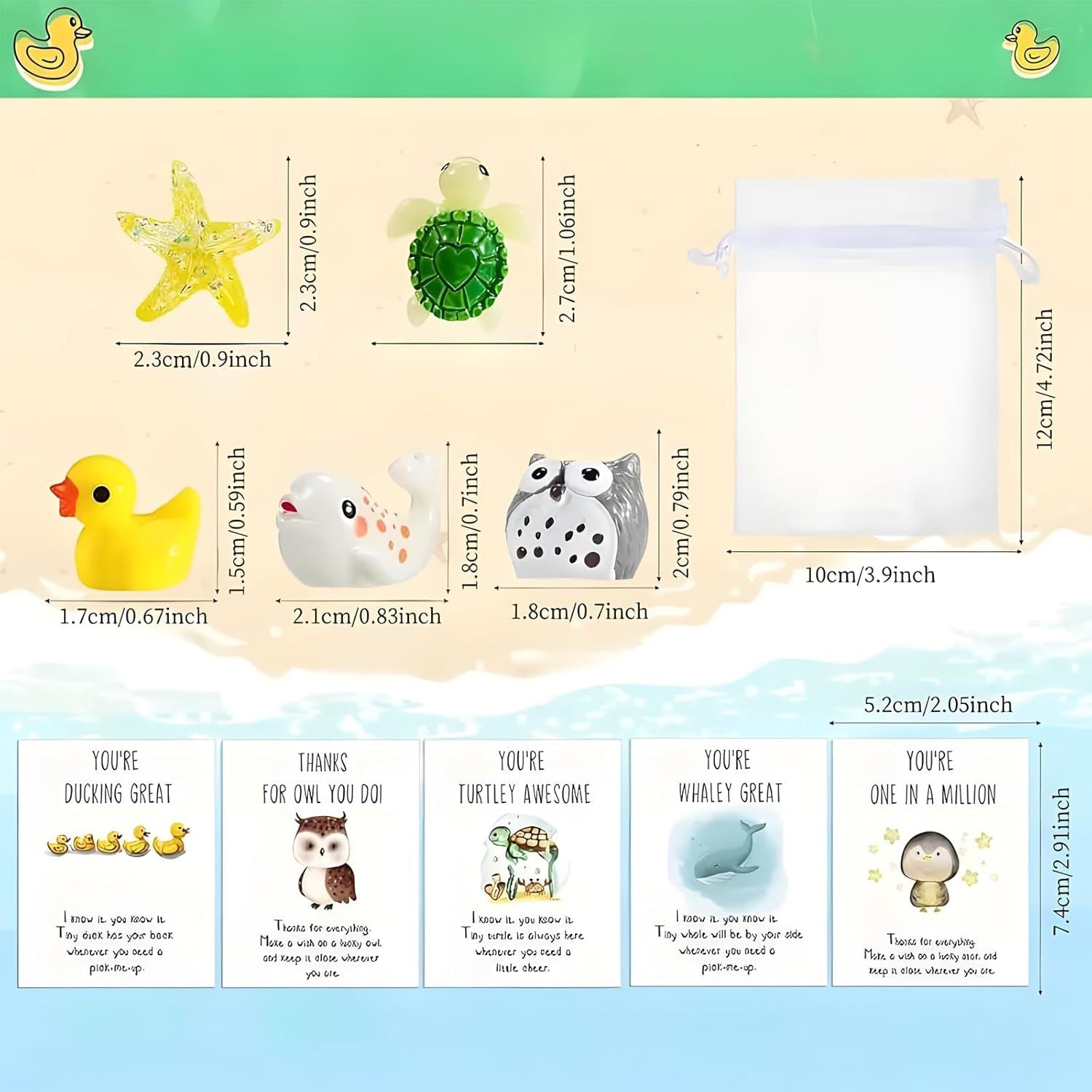 5 Set İçeriği: 5 reçine hayvan hediyesi (🦆 ördek, ⭐ yıldız, 🐋 balina, 🐢 kaplumbağa, 🦉 baykuş) + 5 motivasyonel not kartı + 5 ayrı ayrı paketlenmiş paket