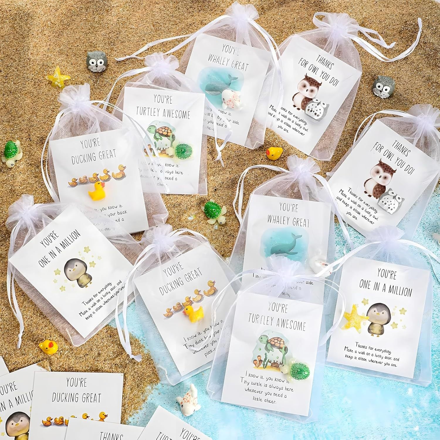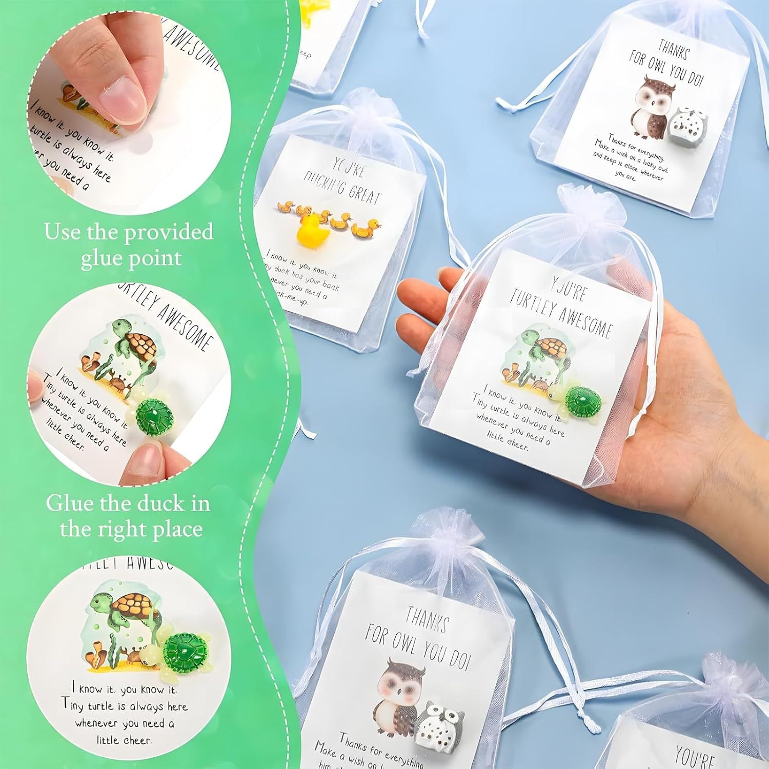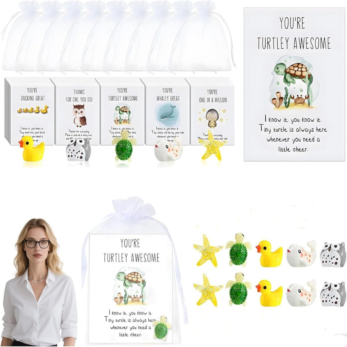 İş arkadaşlarınızdan, sınıf arkadaşlarınızdan, ailenizden, gönüllülerinizden ve arkadaşlarınıza kadar bu hediye setleri, her "teşekkür"ün özel hissettirmesini sağlar. Mevcut Set Boyutları: 5 set (15 adet), 10 set (30 adet), 20 set (60 adet), 25 set (75 adet), 50 set (150 adet), 100 set (300 adet), her set 5 reçine hayvan hediyesi içerir: 🦆 ördekler, ⭐ yıldızlar, 🐋 balinalar, 🐢 kaplumbağalar ve 🦉 baykuşlar. Bunlar, esprili hayvan kelime oyunları ve motivasyon kartlarıyla birleştirilmiştir.