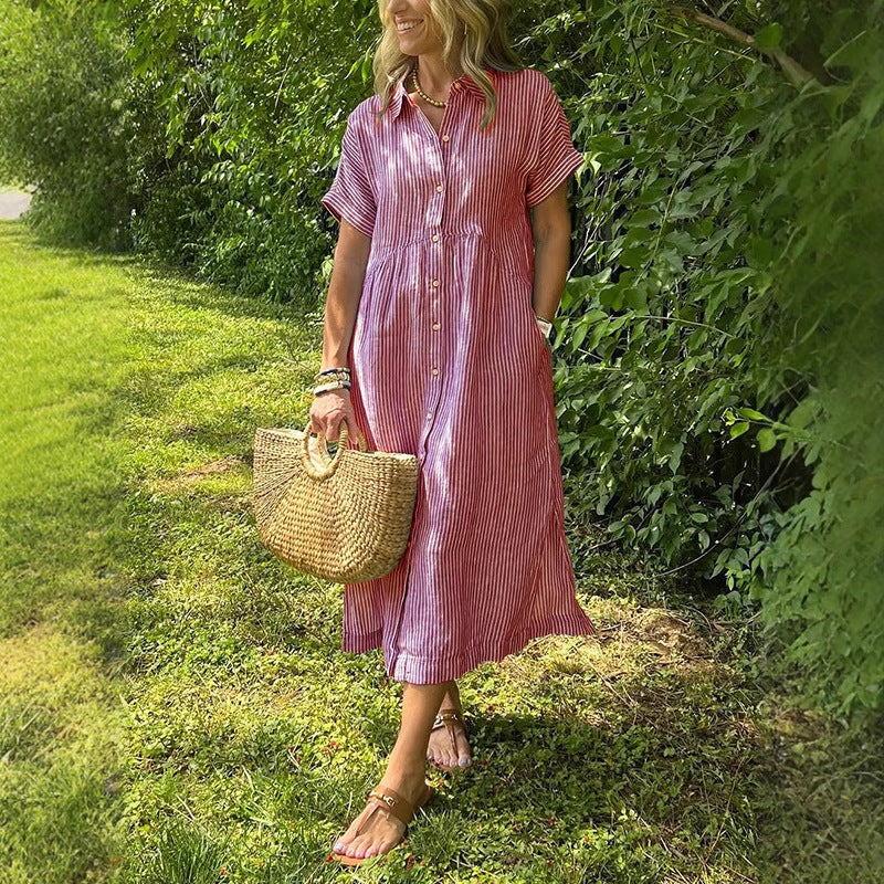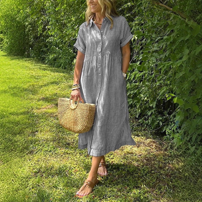 Meet the perfect blend of comfort and elegance! 🌿 This striped short-sleeved shirt dress, made of a lightweight cotton and linen blend, offers breathability in the summer heat. Its natural texture is gentle on your skin and offers a refreshing feel. Its shirt collar and button-down front make it ideal for those who love classic style. A belt at the waist elegantly accentuates your silhouette and creates a balanced look.